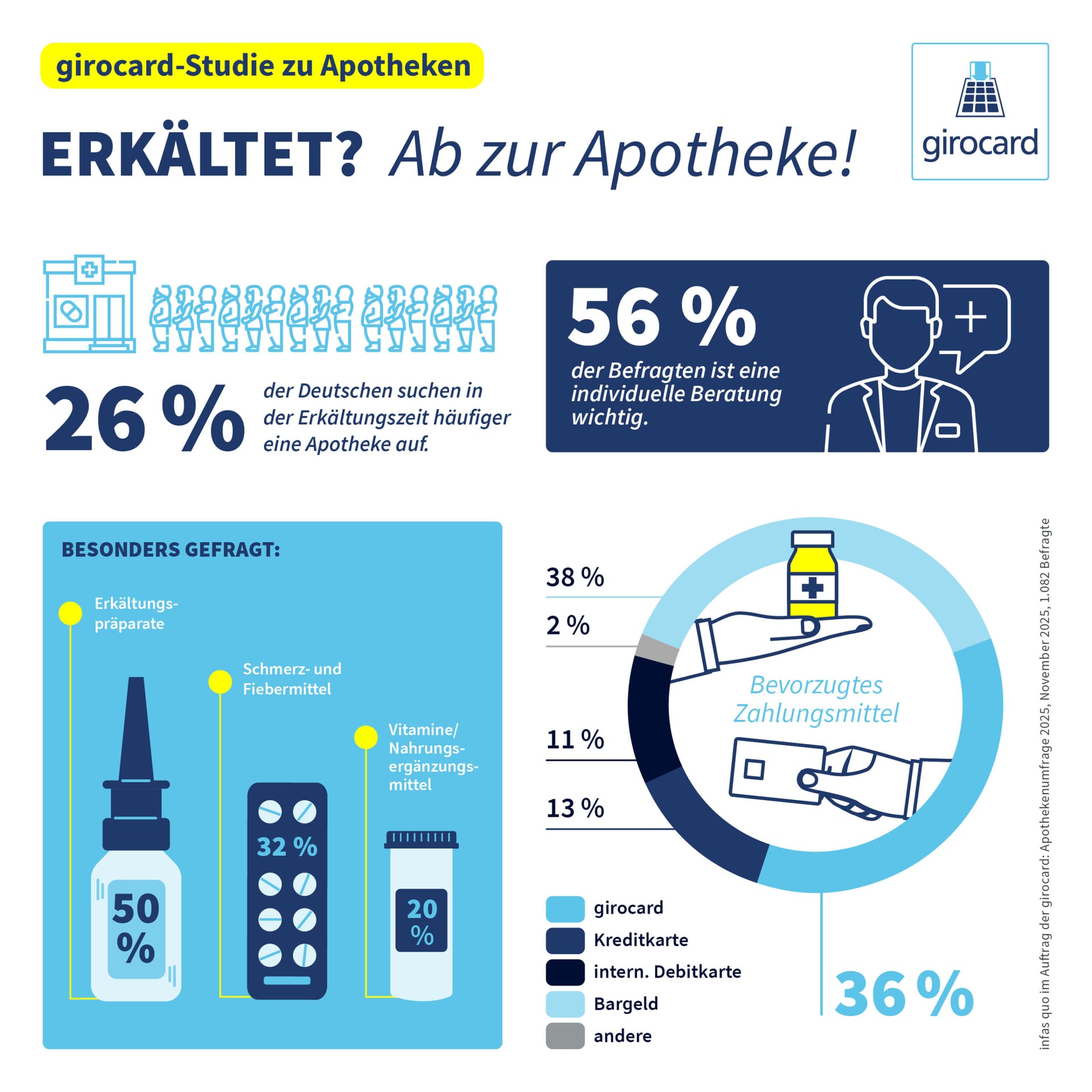 Frankfurt am Main, 22.01.2026: Die Nase läuft, der Hals kratzt – in der Erkältungszeit läuft das Apothekengeschäft auf Hochtouren. Zu diesem Ergebnis kommt eine aktuelle girocard-Studie[1]. In den Wintermonaten nehmen bei einem Viertel (26 Prozent) aller Kundinnen und Kunden die Apothekenbesuche zu. Die Grippesaison beeinflusst nicht nur, wie viel, sondern auch, was in den Apotheken eingekauft wird. Die Hälfte der Befragten gibt an, besonders häufig zu Erkältungspräparaten wie Hustensaft, Nasenspray und Lutschpastillen (50 Prozent) zu greifen – ein Drittel (32 Prozent) kauft auch Schmerz- und Fiebermittel.