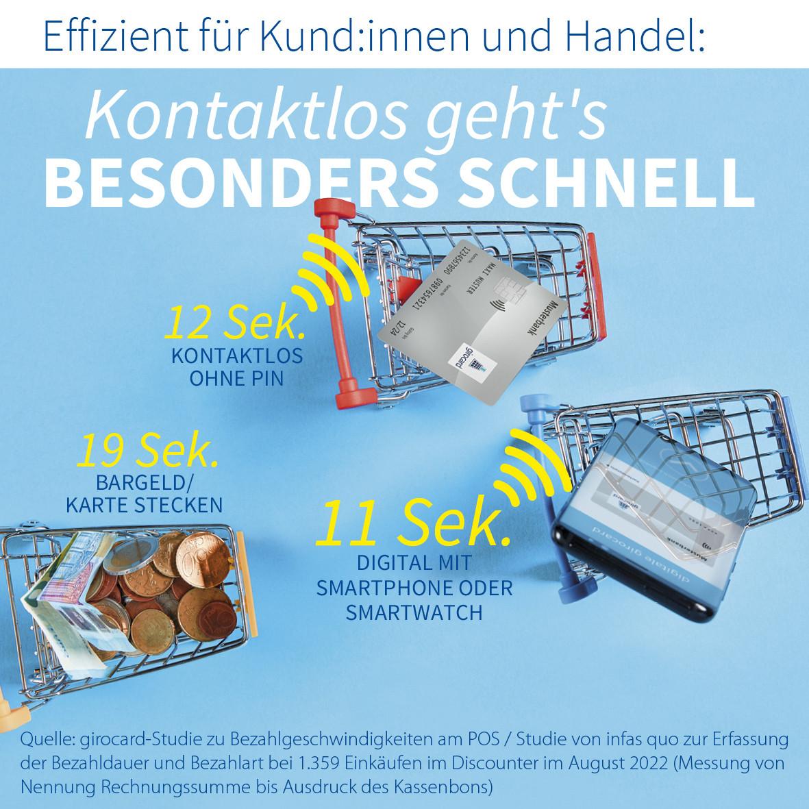 Frankfurt am Main, 12.10.2022: Ein Weg für mehr Effizienz an der Ladenkasse ist das kontaktlose Bezahlen. Das ist nämlich nicht nur beliebt – rund drei Viertel der Zahlungen im girocard-System erfolgen berührungslos –, sondern auch schnell. Durchschnittlich rund zwölf Sekunden dauert eine kontaktlose Kartenzahlung ohne PIN-Eingabe und ist damit die schnellste Bezahlmöglichkeit mit der klassischen Karte. Nur Mobile Payment, also das Bezahlen z. B. mit einer im Smartphone oder in der Smartwatch hinterlegten digitalen Karte, spart an der Kasse mit elf Sekunden noch mehr Zeit. Das ergab eine Studie von infas quo im Auftrag der girocard, bei der im August 2022 bei 1.359 Einkäufen im Discounter die Bezahlgeschwindigkeit gemessen und nach Bezahlart ausgewertet wurde. Eine Zeitersparnis von nur wenigen Sekunden macht für den Handel in Summe einen großen Unterschied. Denn je schneller und bequemer das Bezahlen, desto kürzer die Wartezeit an der Kasse, desto zufriedener die Kund:innen und desto besser für die internen Abläufe.